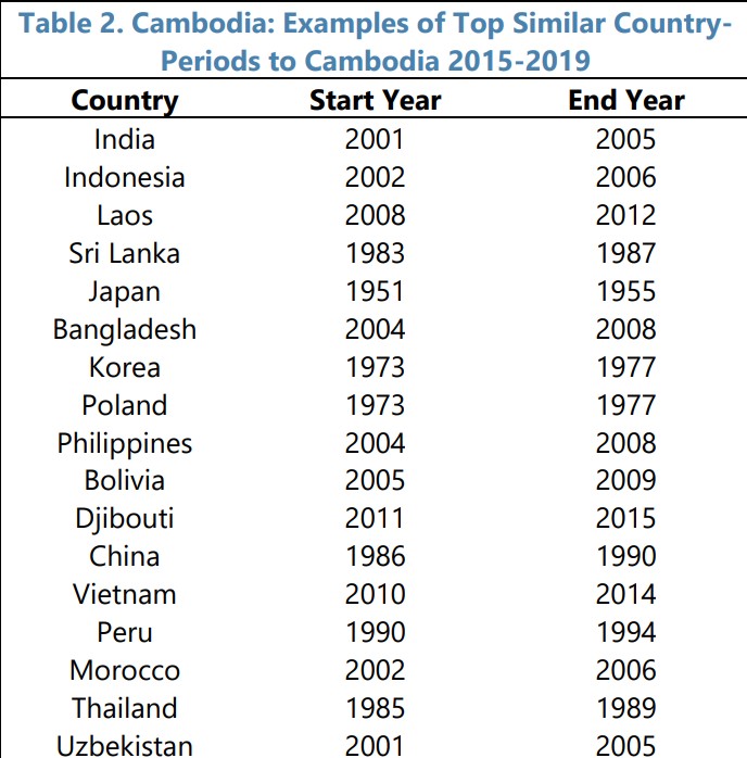 IM says of the approach, that it "offers a novel approach to forecast a target country’s future growth from the historical growth paths of its peers. This approach provides a data-driven and non-parametric way to anticipate potential growth trajectories based on similar historical experiences. It employs a machine-learning technique that compares multivariable sequences of economic data between Cambodia and other countries. This technique makes it possible to identify historical periods in other countries that closely mirror Cambodia’s current economic conditions. The observed growth paths of these historical episodes are then used as a basis for forecasting the future growth trajectory of Cambodia’s economy.