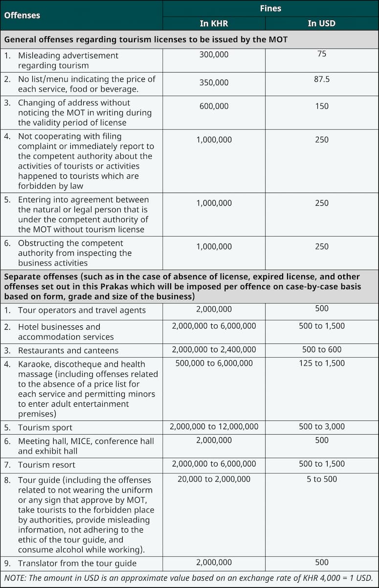 Joint Prakas 537 replaced the previous Prakas such as Joint Prakas 160 on Tourism Related Penalties dated 17 February 2020 and outlines penalties businesses can incut. The penalties include monetary fines (to be paid by a specified deadline) and subsequent fines on late payment of up to 20 million riels (approximately USD $5,000).