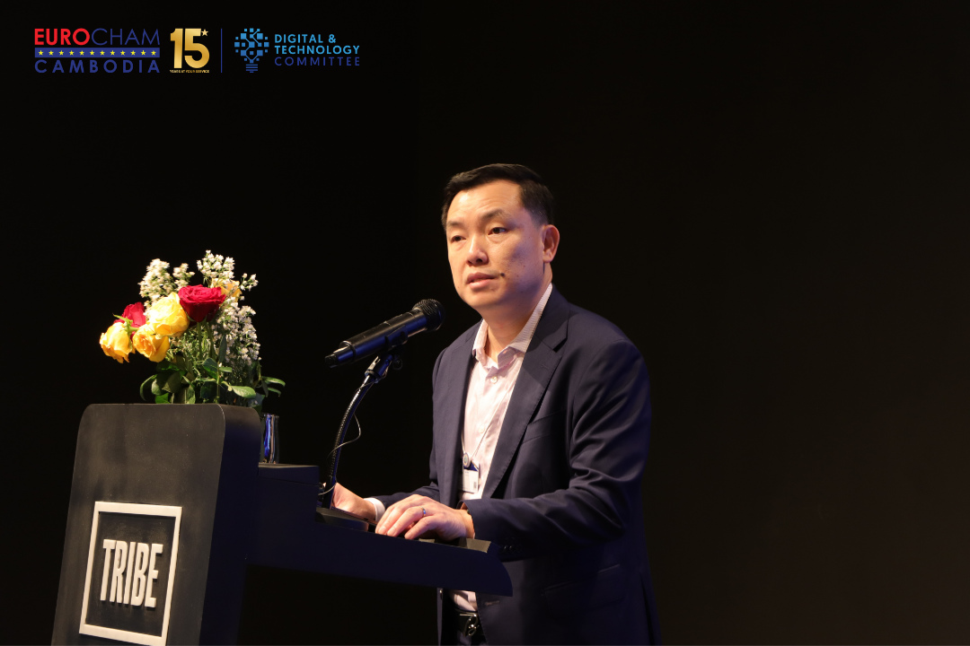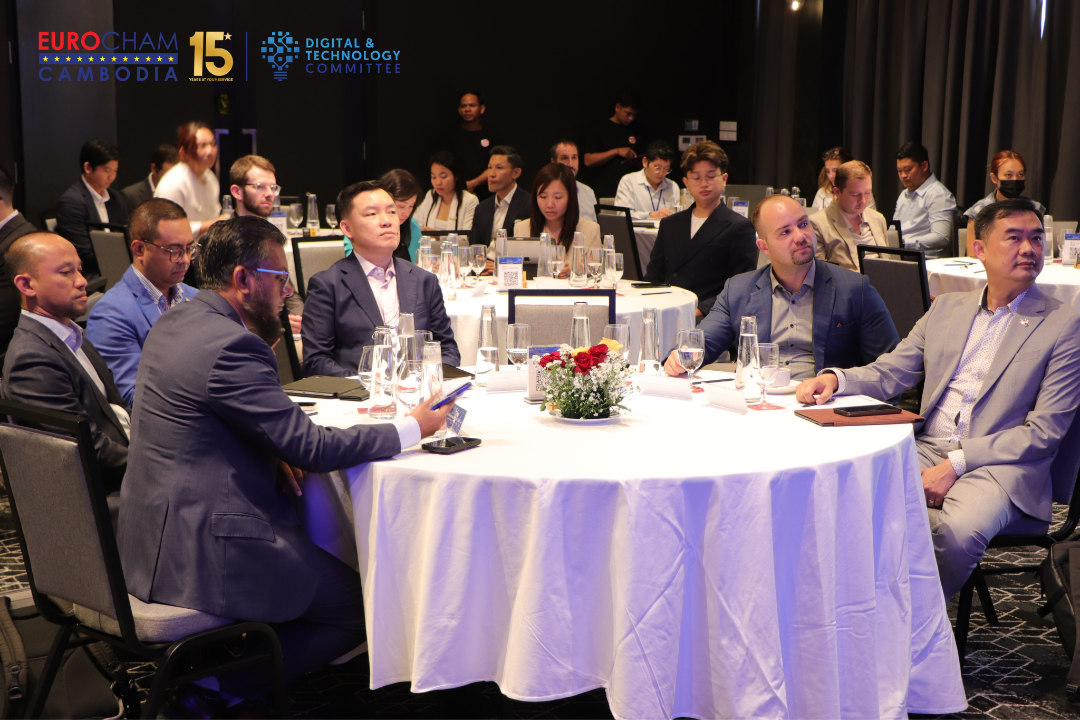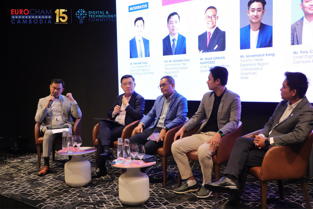 A panel discussion moderated by Kenneth Tang, Vice‐Chairperson of the EuroCham Digital & Technology Committee, brought together perspectives from government, telecom operators, finance, and mobility platforms. Panelists included H.E. Srun Kimsann, Sharif Lukman Mahfoedz (Smart Axiata), Kang Sovannarot (Grab), and Chim Poly (Canadia Bank).