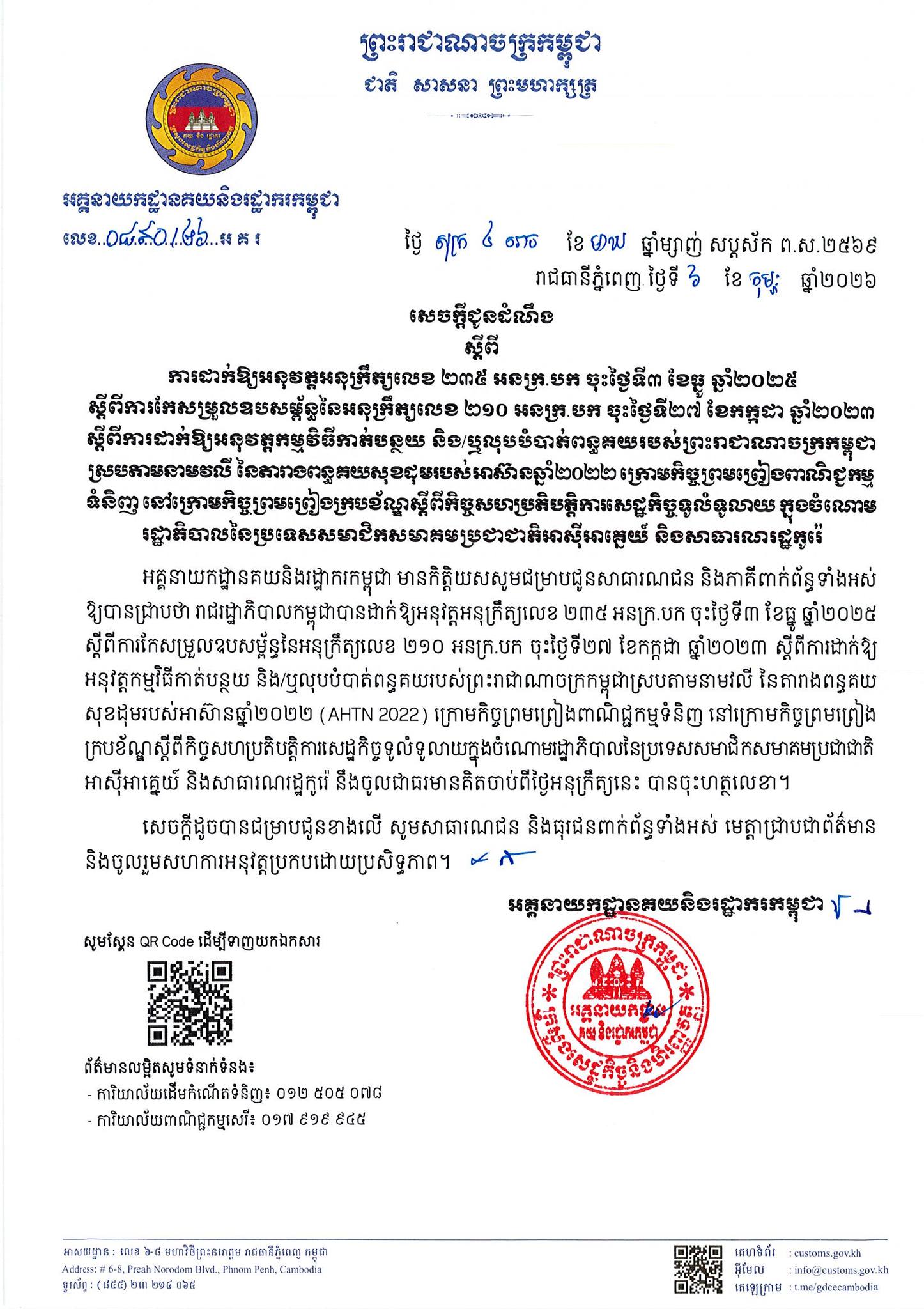 The General Department of Customs and Excise of Cambodia (GDCE) issued a notification on February 6, 2026, regarding the implementation of Sub-Decree No. 235 (dated December 3, 2025), which concerns the reduction or elimination of customs duties for ASEAN member states and the Republic of Korea.