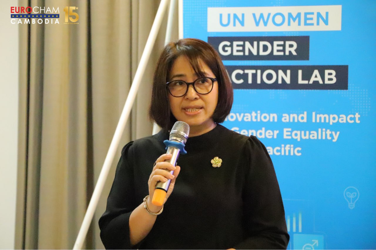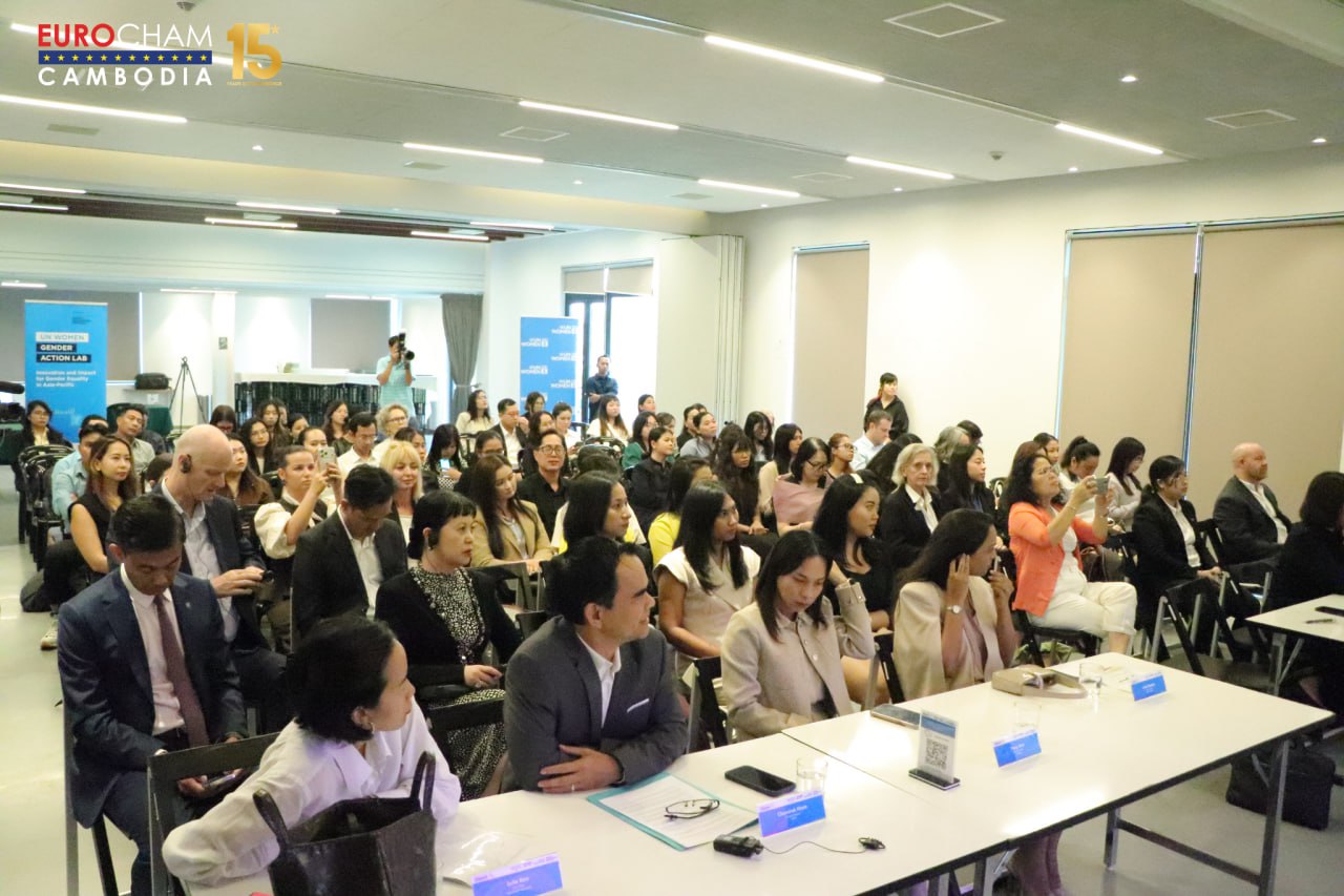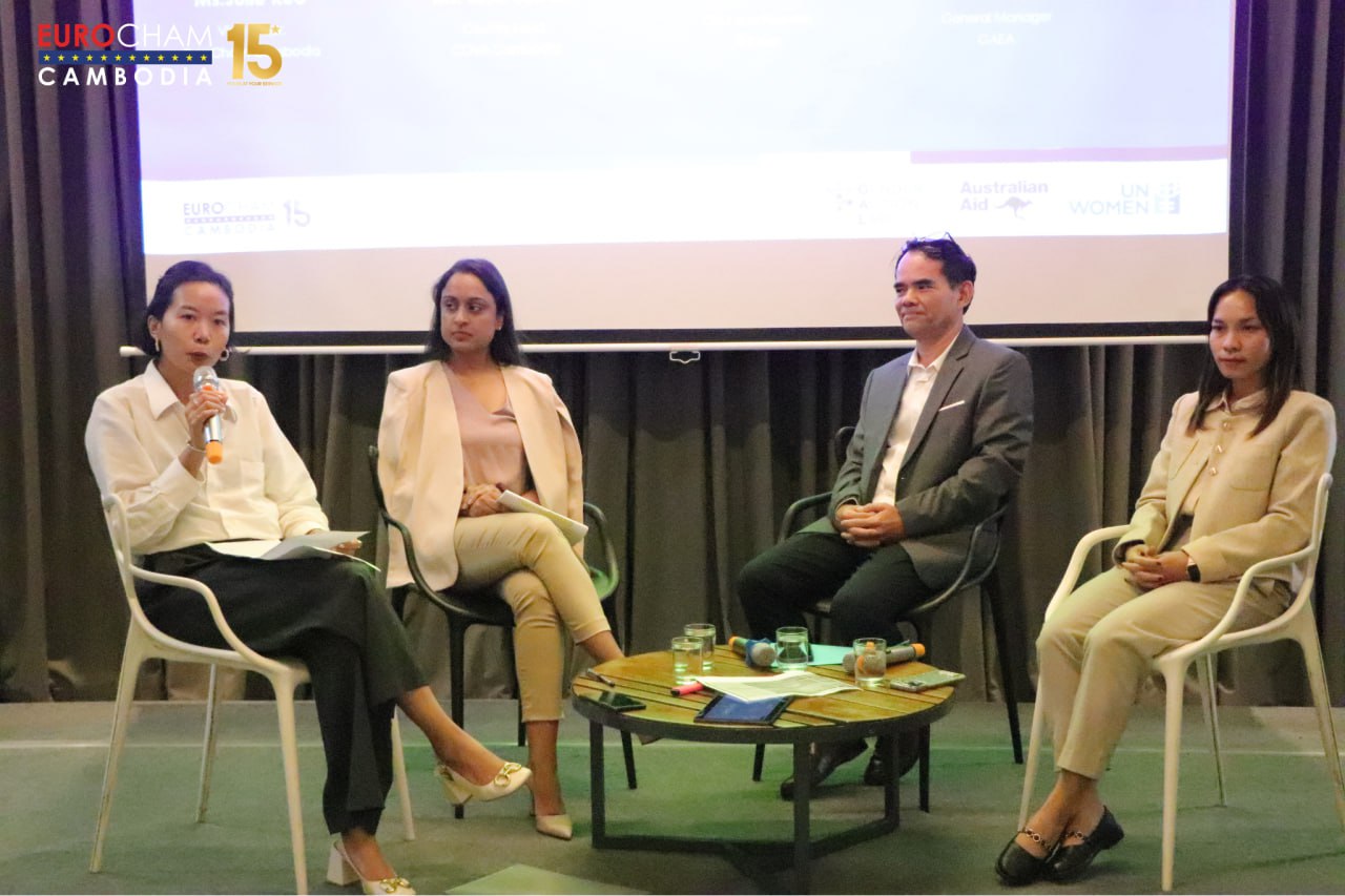 The event’s central panel—moderated by Julie Keo, Board Member of EuroCham and Head of Cambodia EU Desk at DFDL—brought together leaders from COVA Cambodia, GAEA, and SuDrain for an honest conversation on sector-specific barriers, role segmentation in male-dominated industries, and practical interventions companies can adopt. Speakers emphasised that leadership decisions, organisational culture, and inclusive governance determine whether minimum standards translate into real opportunities for women.