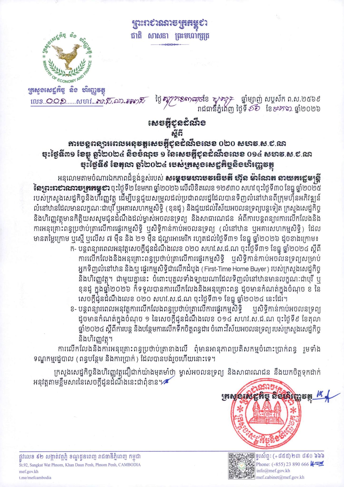 The Ministry of Economy and Finance (MEF) has announced the extension of the implementation of Notice No. 020 (dated December 31, 2024), and Point 1 of Notice No. 014 (dated October 9, 2024), regarding stamp duty exemptions and concessions for the transfer of ownership or possession of real estate.