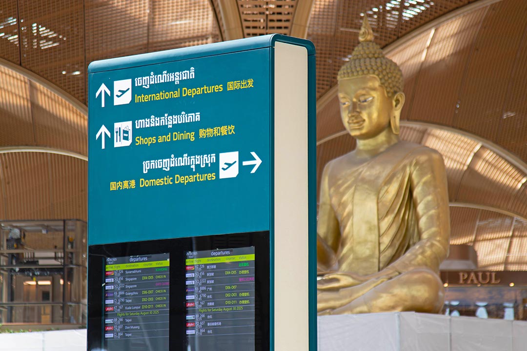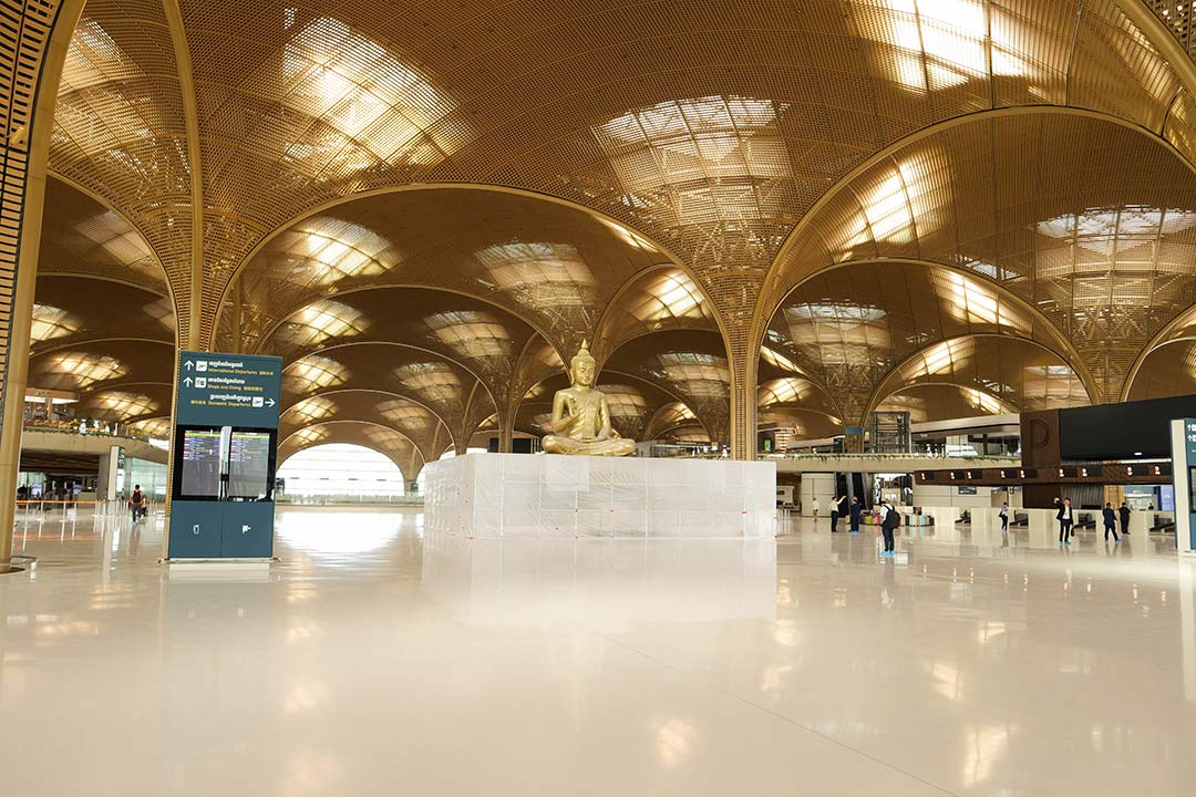 The Techo International Airport departures area is adorned with a nine-metre tall golden buddha statue./B2B Cambodia.