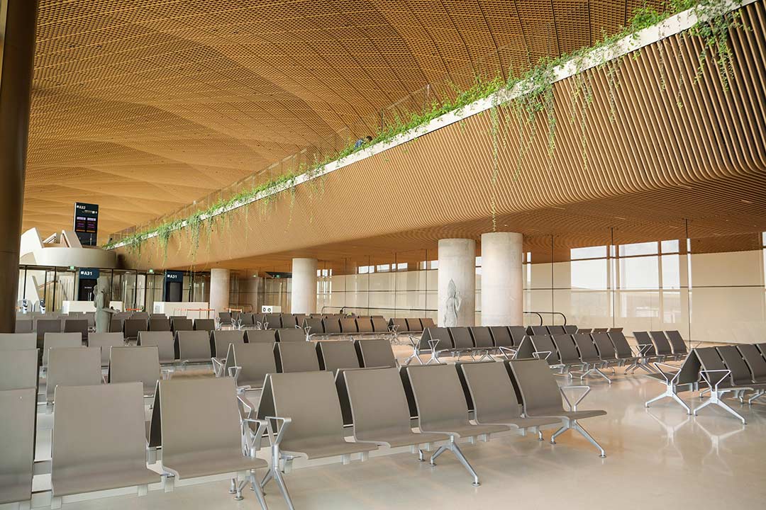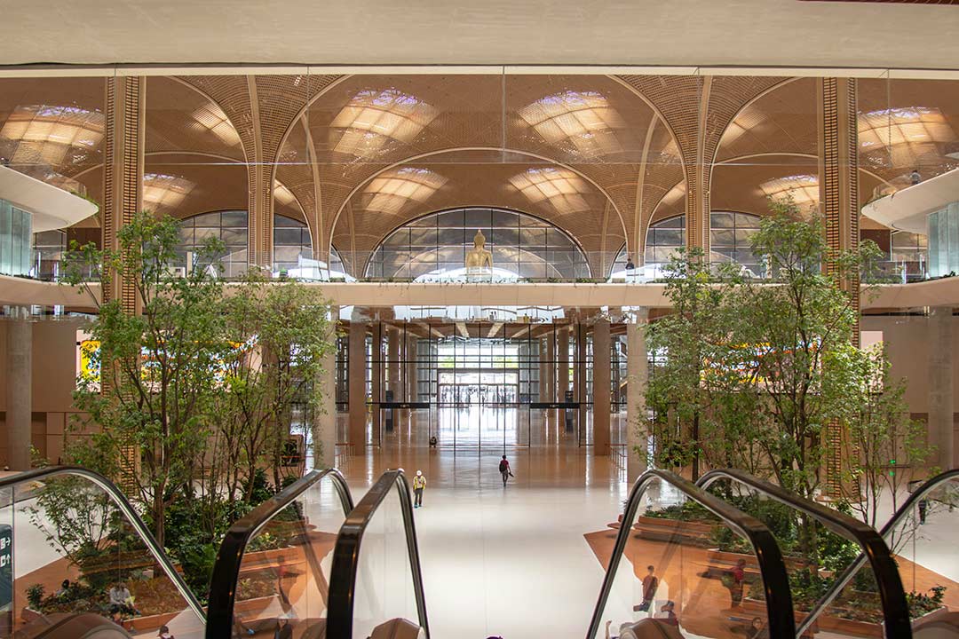 Designed by British international architecture firm Foster + Partners, the airport terminal boasts high ceilings that provide an open and unconstricted experience, with plenty of natural light and greenery, and key design elements inspired by Cambodian culture. The unique lattice design of the ceilings, for instance, draws inspiration from the traditional fabrics and woven baskets of Cambodia heritage handicrafts. The terminal’s symmetrical design and careful consideration of how light enters and moves across the building also takes inspiration from Angkor Wat. At both day and night, the airport is described to appear as a “cathedral of light”, with natural light and cozy lighting making it stand out as a visible monument in Takhmao city.